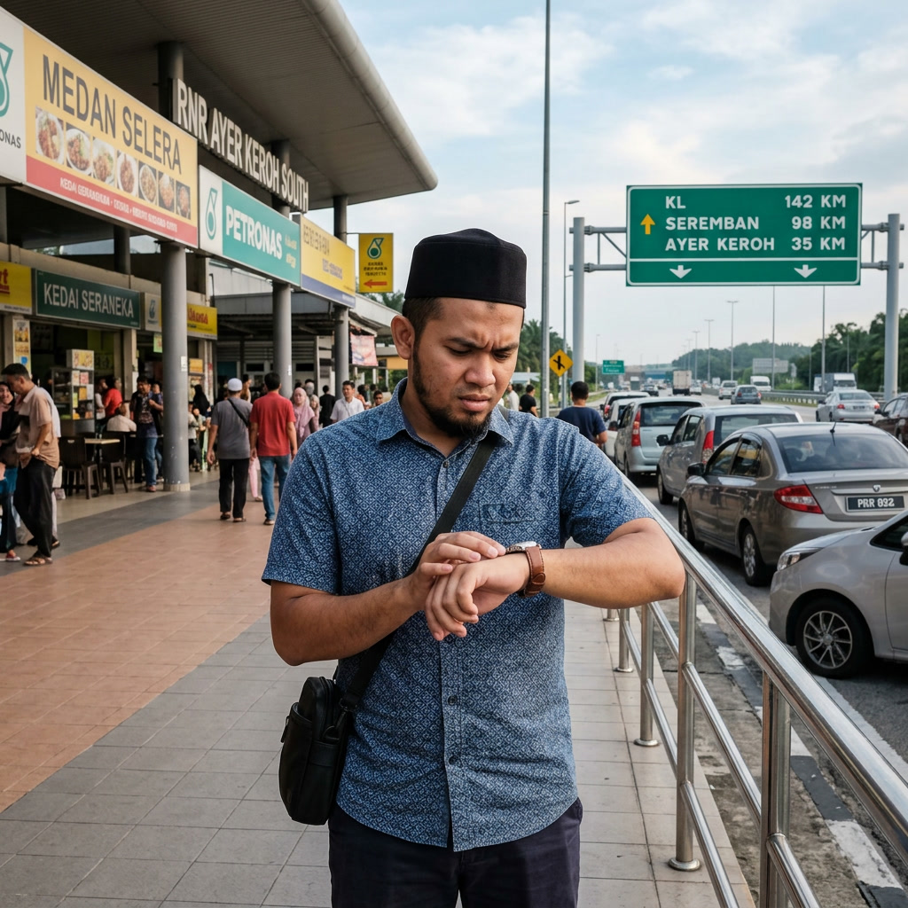 ❌ Kereta langsung tak bergerak. Waktu Maghrib makin habis, Isyak dah nak masuk. Nak solat dalam kereta atau singgah di R&R?